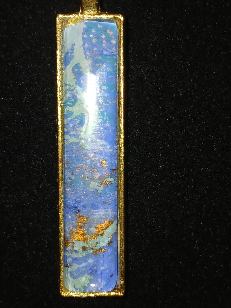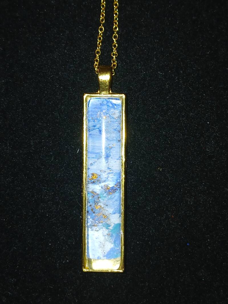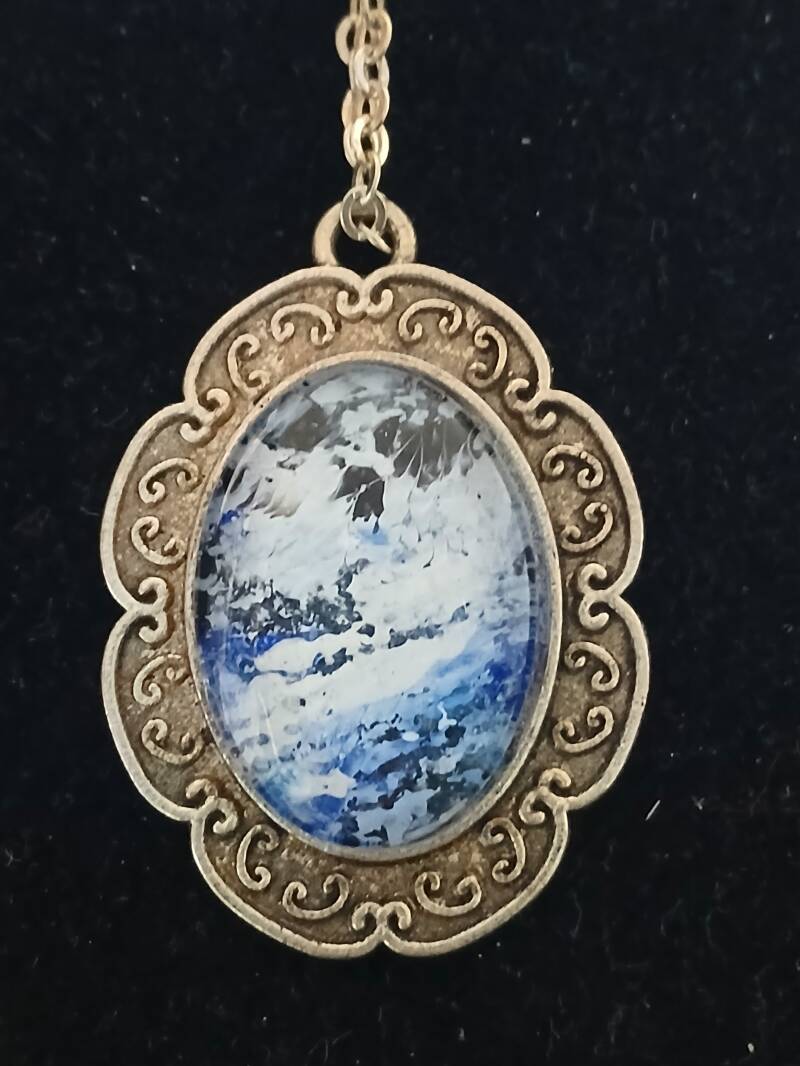 Collier chaîne dorée 25cm, peinture a l huile bleu outre-mer sur toile, médaillon avec globe en verre : 90 euros