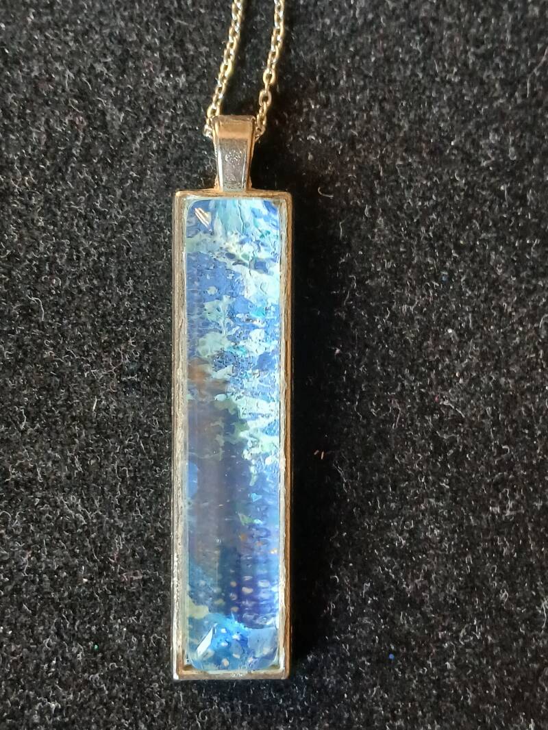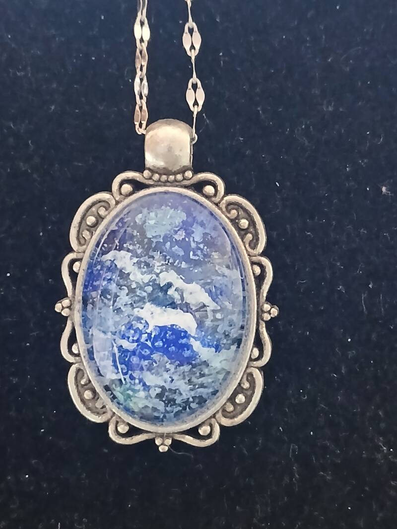 Collier métal argenté chaine25 cm, médaillon peinture a l huile bleu avec globe en verre: 90 euros