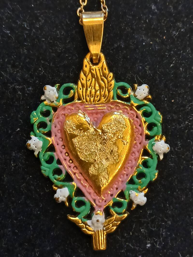 Collier chaîne dorée 20cm, peinture rose et vert, coeur feuille d or: 120 euros