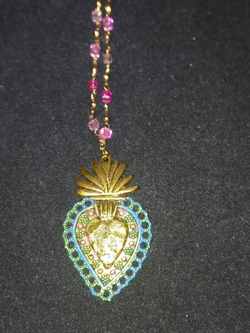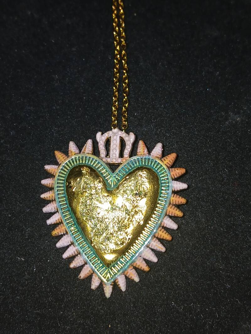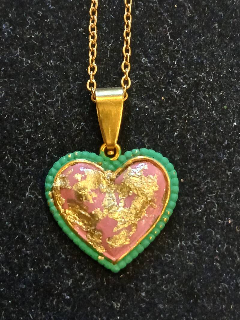 Collier chaîne dorée 25cm, peinture vieux rose coeur feuille d or : 120 euros