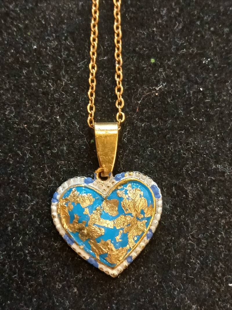 Collier chaîne dorée, 23cm, peinture bleu, blac, coeur feuille d or: 120 euros