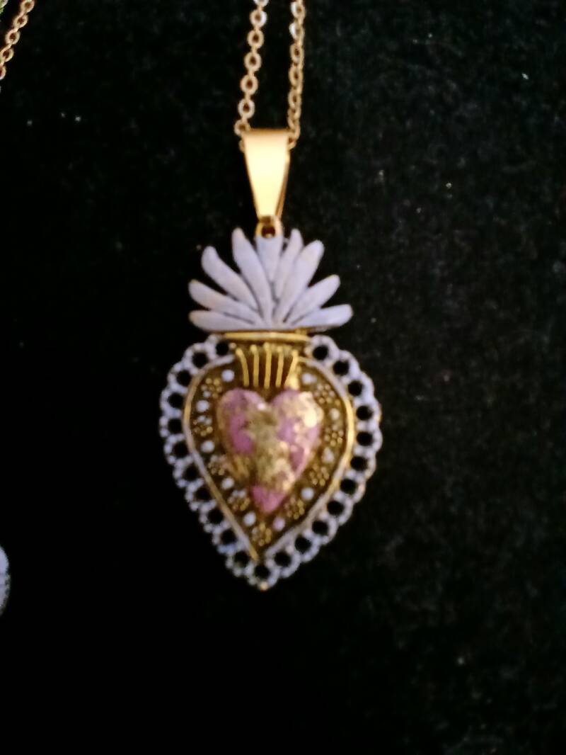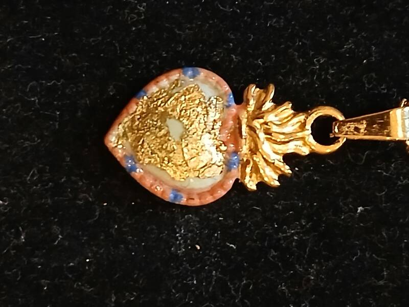 Collier chaîne dorée 25cm , création cœur peinture rose et verre coeur feuille d or : 150 euros